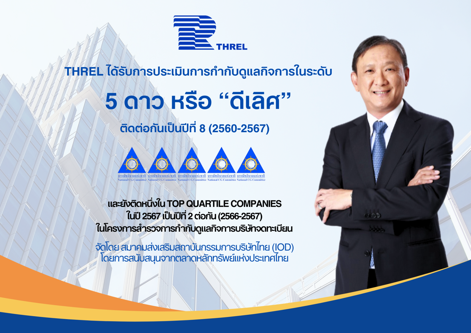 บริษัท ไทยรีประกันชีวิต จำกัด (มหาชน) หรือ THREL นำโดยนายวิพล วรเสาหฤท กรรมการผู้จัดการ โชว์ศักยภาพความเป็น เลิศด้านการดำเนินงาน ได้รับคะแนนการประเมินการกำกับดูแลกิจการในระดับ 5 ดาว หรือ “ดีเลิศ”(Excellent CG Scoring)