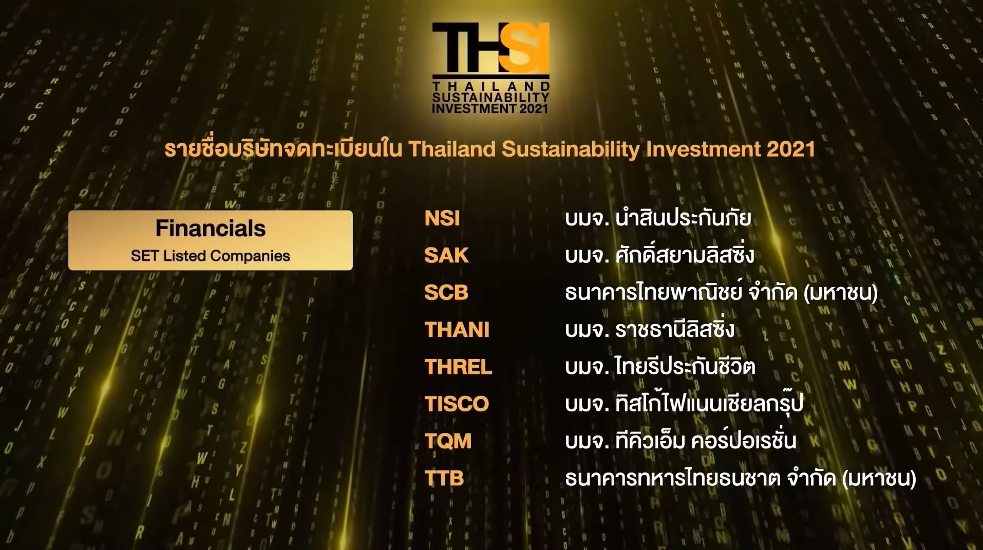 สำหรับรางวัล “หุ้นยั่งยืน THSI” แสดงให้เห็นถึงการมีแนวทางบริหารจัดการภาวะวิกฤตที่ครอบคลุมถึงการรับมือกับสถานการณ์การแพร่ระบาดได้อย่างชัดเจน โดยนำปัจจัย New Normal เช่น ประเด็น Digital Transformation และพฤติกรรมผู้บริโภคที่เปลี่ยนไป มาพิจารณาเป็นส่วนหนึ่งของความเสี่ยงที่อาจเกิดขึ้นใหม่ (Emerging Risk) เพื่อปรับตัวและตอบโจทย์ความท้าทายในอนาคต นอกจากนี้ ยังให้ความสำคัญกับการดูแลสุขภาพและความปลอดภัยของพนักงานเพื่อให้ธุรกิจดำเนินได้อย่างต่อเนื่องและ รักษาประสิทธิภาพในการปฏิบัติงาน (Operational Efficiency) รวมถึงการช่วยเหลือสังคม ผู้มีส่วนได้เสียทั้งลูกค้าและคู่ค้า เพื่อก้าวผ่านสถานการณ์ไปด้วยกัน และมีพัฒนาการโดดเด่นด้านสิ่งแวดล้อม โดยเฉพาะการกำหนดเป้าหมายเชิงปริมาณและเปิดเผยข้อมูลการลดการปล่อยก๊าซเรือนกระจก เพื่อร่วมแก้ไขปัญหาการเปลี่ยนแปลงสภาพภูมิอากาศและเป็นส่วนหนึ่งในการขับเคลื่อนประเทศไทยไปสู่สังคมคาร์บอนต่ำ