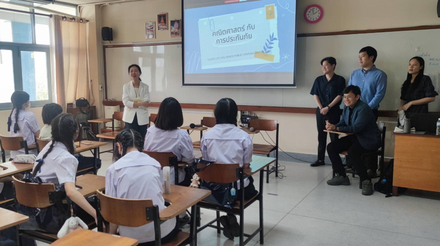 คุณสิรินทร์ ธรรมอุปกรณ์ ผู้บริหารสูงสุดสายงานบัญชีและการเงิน พร้อมด้วยเจ้าหน้าที่จากฝ่ายบริหารความเสี่ยง ของ บมจ.ไทยรีประกันชีวิต ได้ร่วมจัดกิจกรรม คณิตศาสตร์กับการประกันภัยขึ้น ซึ่งเป็นส่วนหนึ่งในรายวิชา คณิตศาสตร์กับการประกันภัย เพื่อสร้างความตระหนักถึงความสำคัญของการให้ความรู้ทางการเงินเพื่อความยั่งยืน โดยมีนักเรียนชั้นมัธยมศึกษาปีที่ 2 จากโรงเรียนราชินีบน ร่วมรับฟังการบรรยายและทำ workshop วางแผนทางด้านการเงินของตนเอง